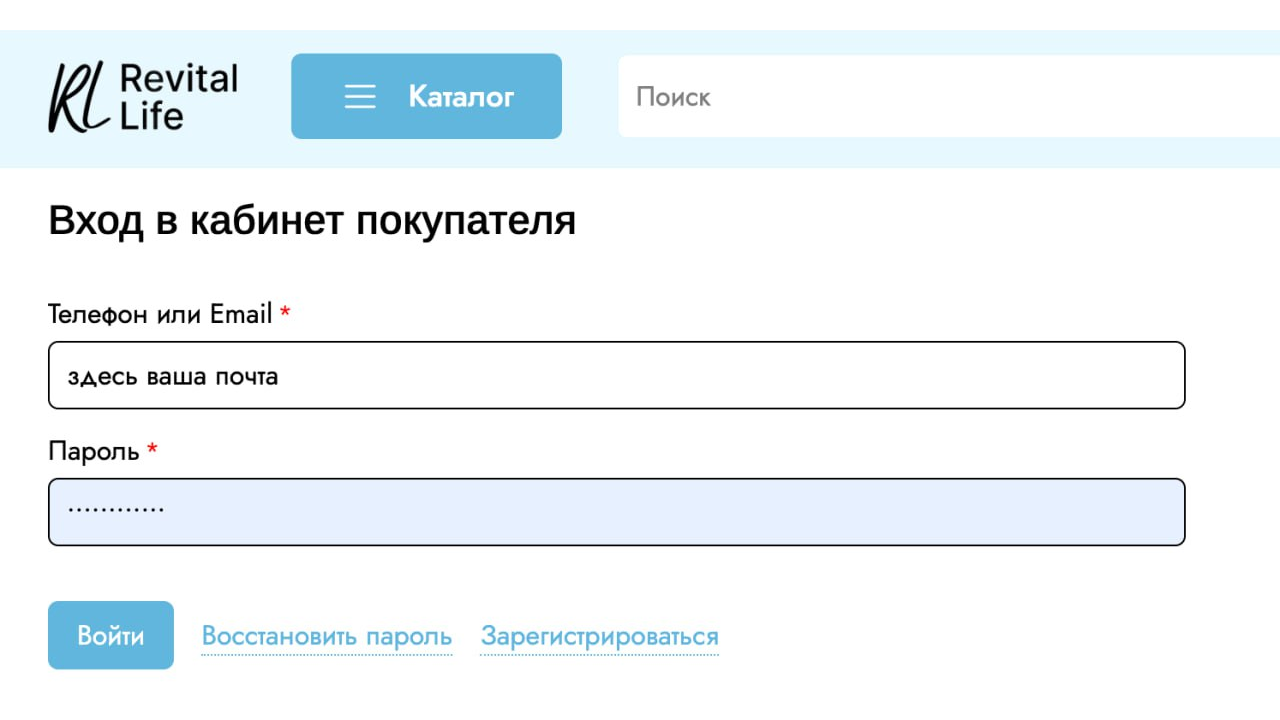 2. Войдите в свой личный кабинет покупателя путем введения своей электронной почты и пароля. Пароль приходил вам на электронную почту при регистрации или активации аккаунта. Проверяйте папку «Спам» или «Промоакции».