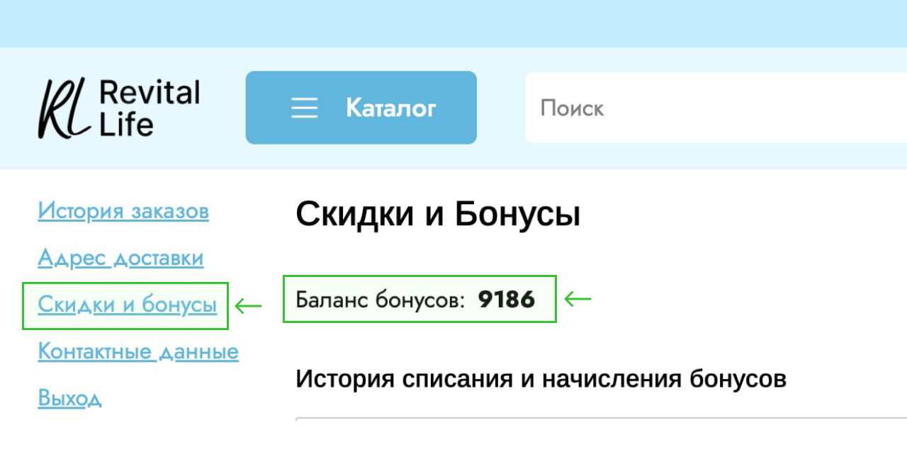 Перед формированием заказа вы можете проверить актуальное количество бонусов в своем Профиле в разделе «Скидки и бонусы».
